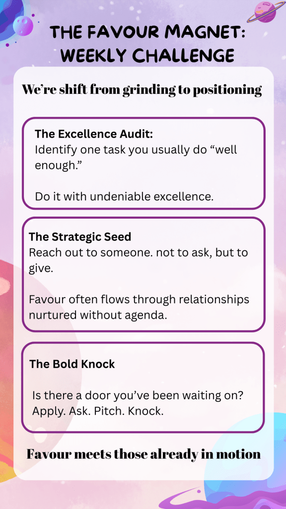 - Efficiency over exhaustion: Hard work is constant. Favour is a multiplier.